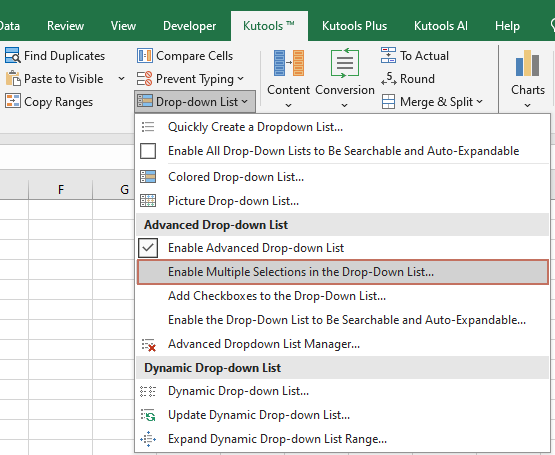 - Select Kutools > Drop-down List > Enable Multiple Selections in the Drop-Down List.